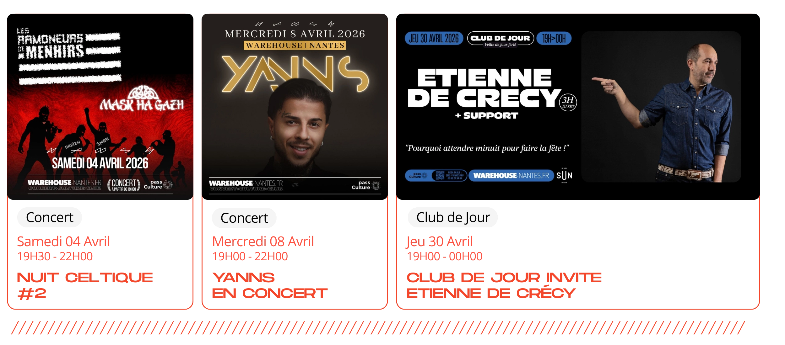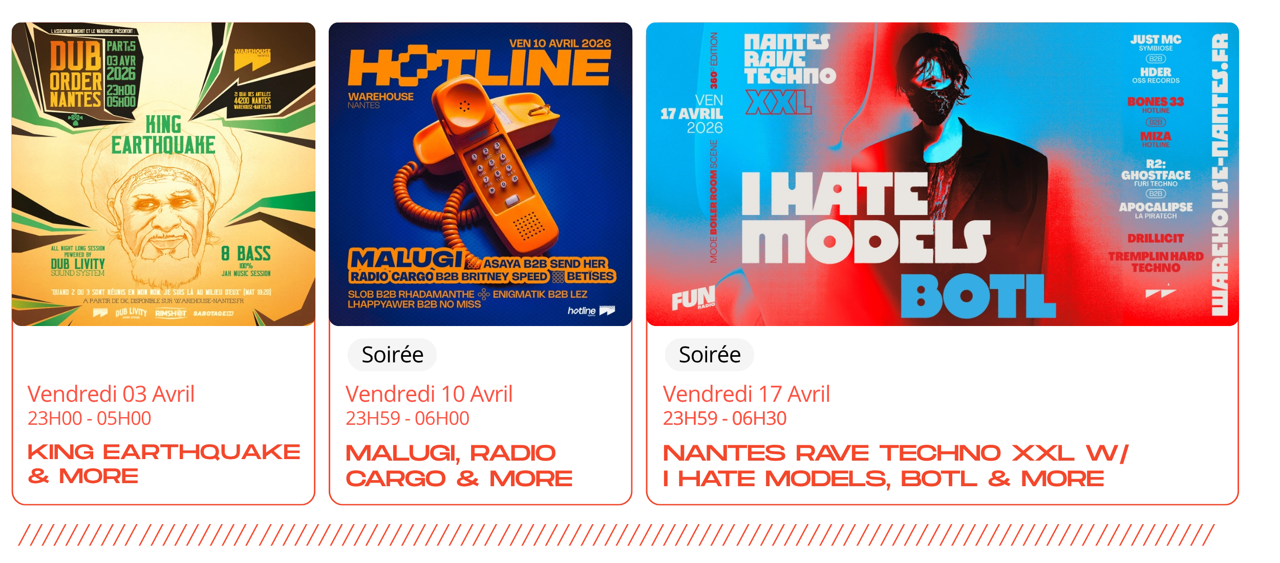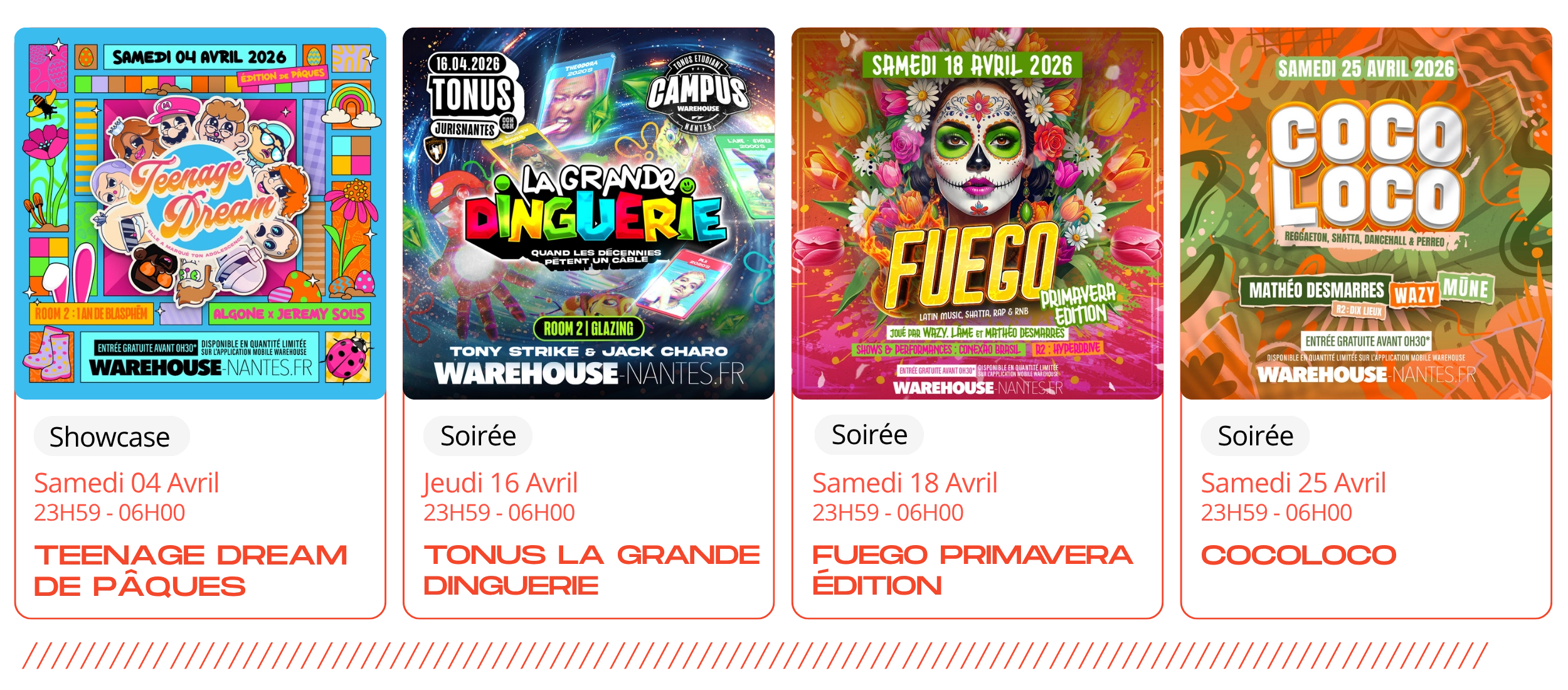 Les journées s’allongent, les températures remontent, et au Warehouse, la programmation suit le mouvement avec un mois dense et varié. Entre les showcases XPLICIT, soirées XXL avec Nantes Rave Techno et Versus, un Club de Jour pour profiter avant le coucher du soleil, et les classiques Fuego, Cocoloco ou Teenage Dream, chaque semaine apporte son lot de moments forts. Un mois où les styles se croisent, où les publics se mélangent, et où chaque soirée raconte quelque chose de différent !