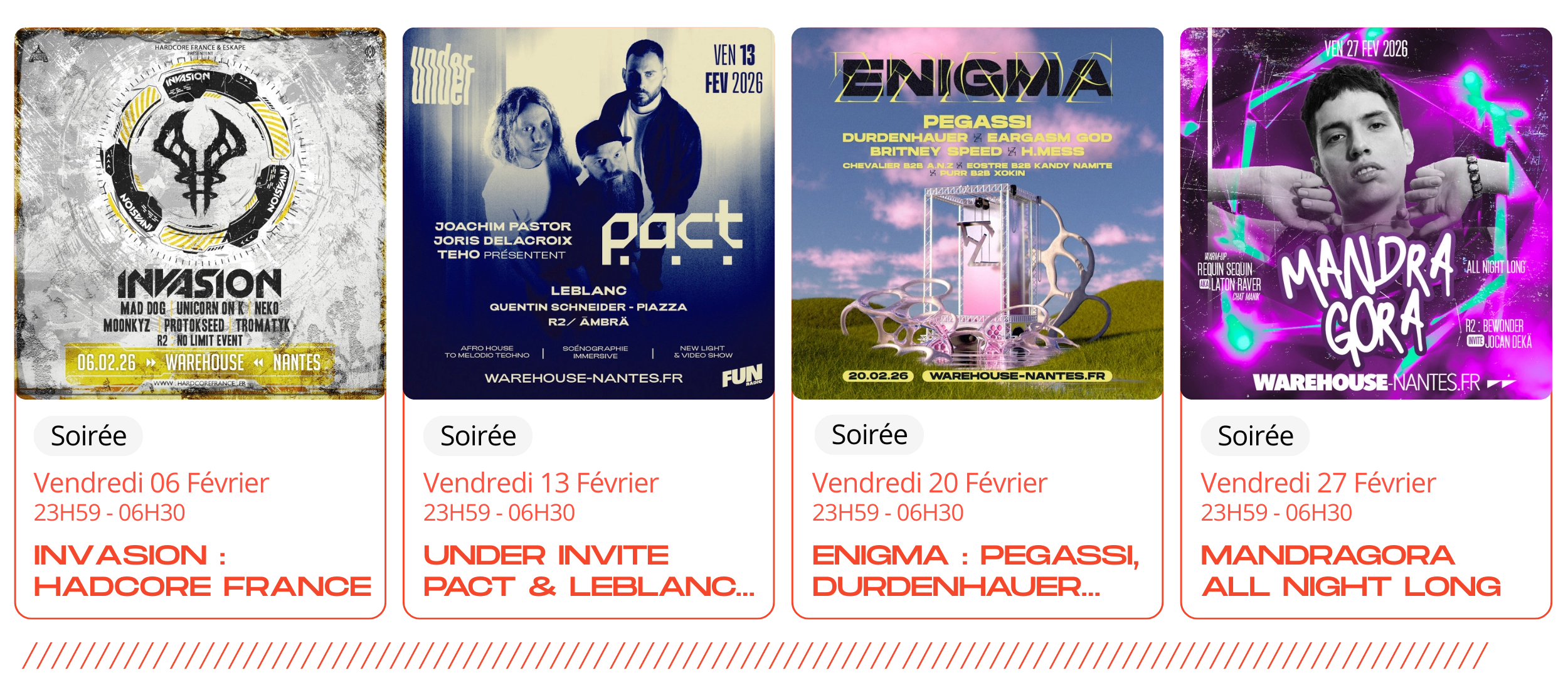 En février, le Warehouse déroule une programmation dense et plurielle, fidèle à son ADN. Soirées techno et hard music, rap, shatta, formats club alternatifs, showcases exclusifs et rendez-vous étudiants rythment le mois ! Tour d’horizon des soirées à ne pas manquer…
