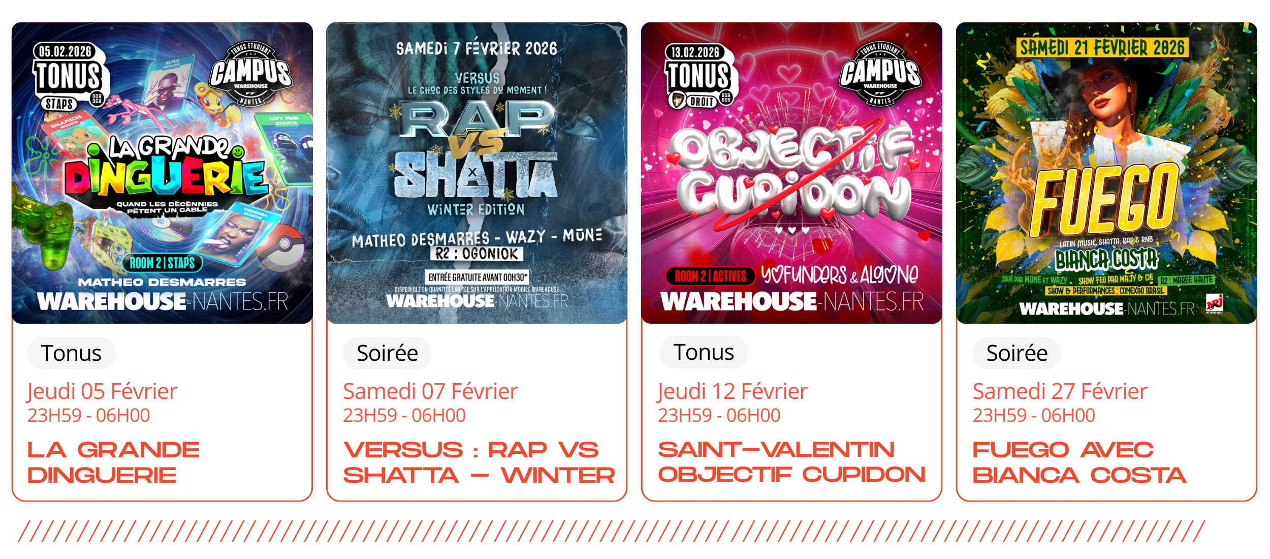 Les Tonus étudiants | Les Tonus continuent de rythmer le mois avec deux rendez-vous incontournables. Jeudi 5 février – Tonus La Grande Dinguerie lance le mois, suivi du jeudi 12 février – Tonus Saint-Valentin (Jurisnantes). Deux soirées étudiantes pensées pour rassembler, faire la fête et prolonger une tradition bien ancrée au Warehouse.